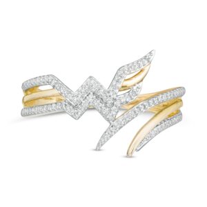 Crafted in warm 10K gold, this split-pronged ring features a subtle bypass design with a curved polished and diamond-lined ribbon. Featuring 1/8 carat diamonds with a dazzling polished luster, this ring is uniquely yours.